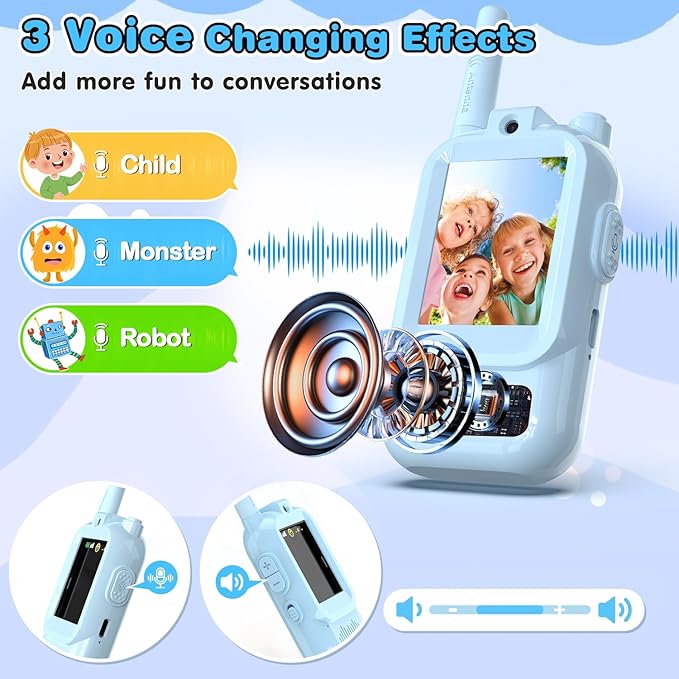- 【Voice Changer & Video Effects】This walkie talkies built-in voice changer with 4 effects (original, child, monster, male voice) plus fun video modes to spark creativity. Turn your kid into a robot, alien, or monster at the press of a button! Perfect for role-playing, imaginative games, and laughter-filled moments.