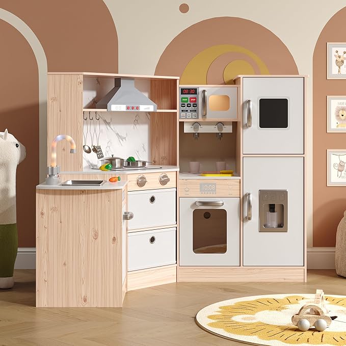 - Safe & Durable Construction: Crafted from high-quality wood materials with smooth, rounded edges, this kitchen set for kids meets strict safety standards (ASTM). It's designed to provide a completely safe play experience, giving parents total peace of mind.