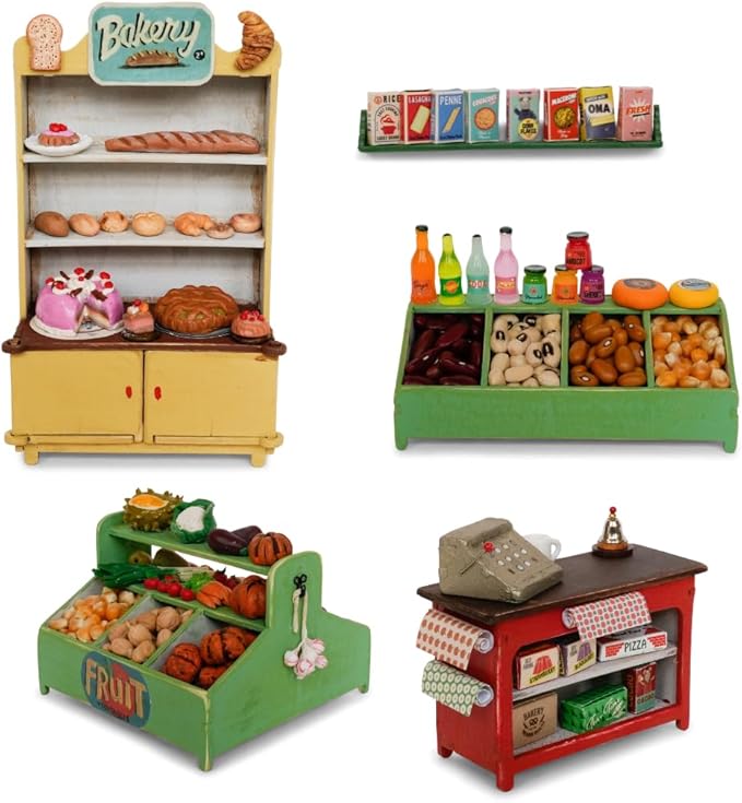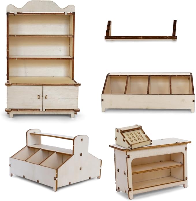 - COMPLETE DOLLHOUSE SHOP CRAFTING KIT: Transform simple materials into a bustling miniature store with this all-inclusive set - features beautifully printed cardboard room with shop window designs pre-cut wooden shop furniture decorative paper elements for products and signs and step-by-step instructions (paint and glue sold separately)
