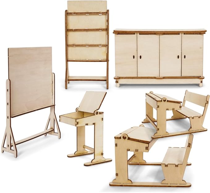 Classroom Dollhouse Craft Kit – Easy to Build & Paint School Room | Cardboard Room + 6 Wooden Pieces + Decoration Sheets | 1:12 Scale | Sam & Julia's Mouse Mansion