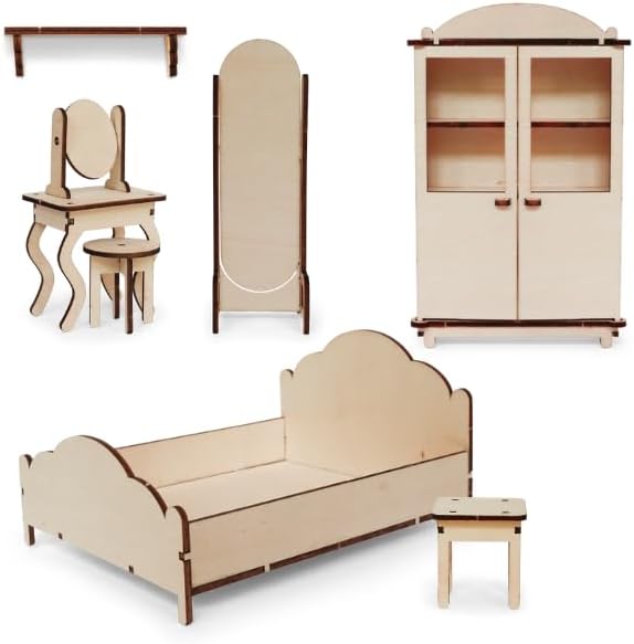 - BUILD 6 BEDROOM FURNITURE PIECES: Including a comfortable bed with headboard spacious wardrobe cabinet elegant dressing table for morning routines wall mirror for getting ready and two matching bedside tables for bedtime books - all precisely pre-cut from smooth wood in authentic 1:12 dollhouse scale