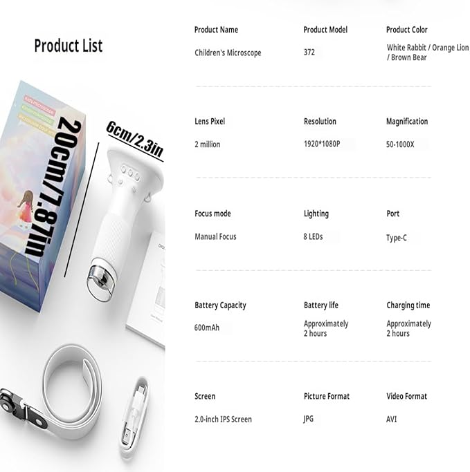 - 【2.0 Inch IPS Color Display & 1000X Magnification】Equipped with a 2-inch HD IPS eye-protection screen, this microscope for kids delivers vivid, true-to-life colors and sharp imaging for intuitive real-time observation. The 1000X high magnification covers most daily exploration need—letting children easily dive into the fascinating microscopic world